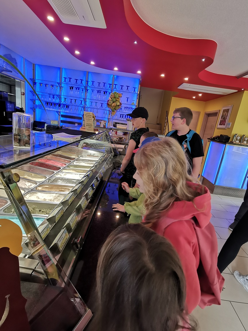 Als alles gemischt war, kam der Brei in die Eismaschine. Nun brauchten wir nur noch Geduld, bis es fertiges Eis war. Und endlich durften wir alle kosten. Es war sehr lecker. Und noch besser war, dass wir uns noch eine andere Kugel aussuchen durften zum Kosten. Es gab so viele Sorten, da fällt es schwer auszusuchen. Aber wir haben alle unsere Lieblingssorte gefunden.