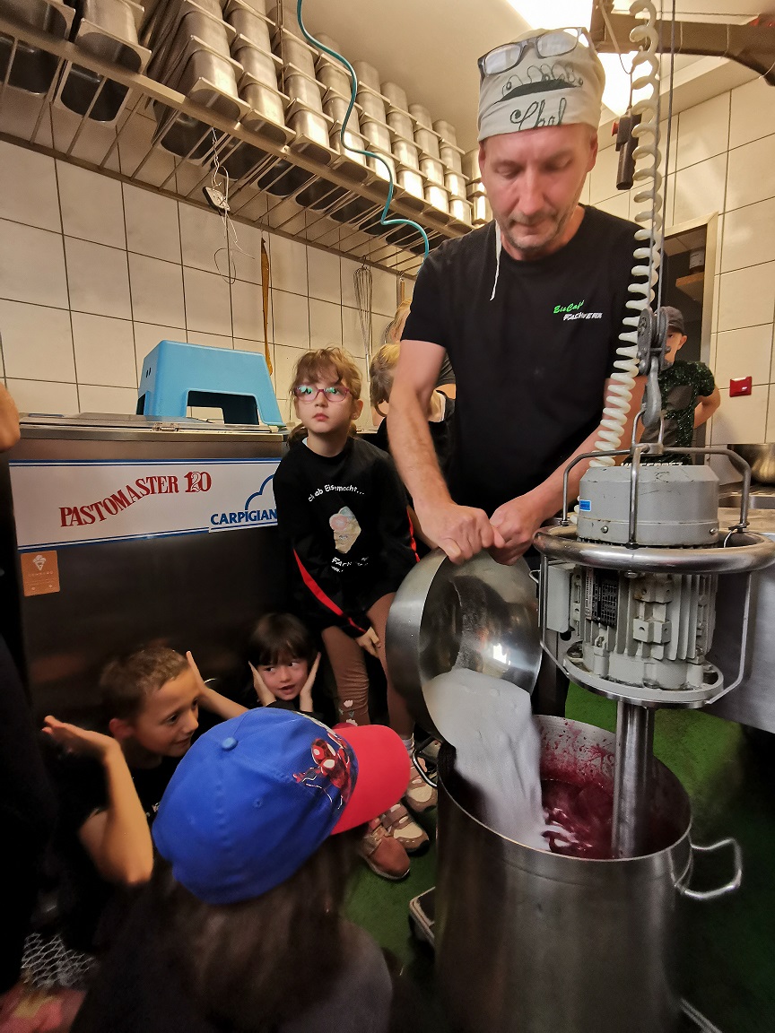 Als wir angekommen sind, hat uns der Chef sehr nett begrüßt. Der Chef heißt Herr Trenkelbach und er ist ein richtiger Eismacher.