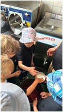 Ein Highlight war natürlich die gemeinsame Eisproduktion. Herr Trenkelbach stellte zusammen mit den Kindern Himbeereis her – aus frischen Früchten! Die Kinder erfuhren dabei, woher die Zutaten stammen und wie z. B. die Himbeeren vorbereitet werden. Besonders spannend war das Verkosten einzelner Zutaten wie Dextrose, Salz oder Glukose, die für die richtige Konsistenz und Süße im Eis sorgen.